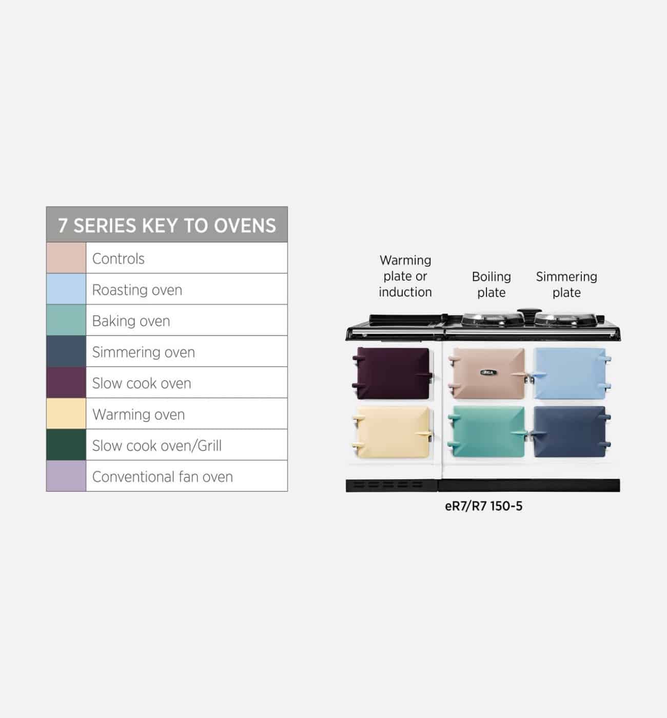 - The AGA eR7 150i offers three cast-iron heat storage ovens for roasting, baking and simmering and two additional independently controllable ovens for slow cooking and warming.