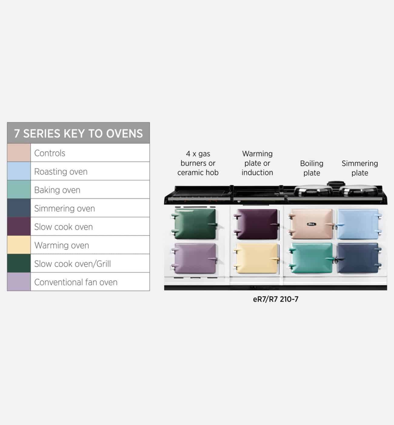- The AGA eR7 210 offers three cast-iron heat storage ovens – for roasting, baking and simmering – and two hotplates which are controlled by a touch-screen control panel.