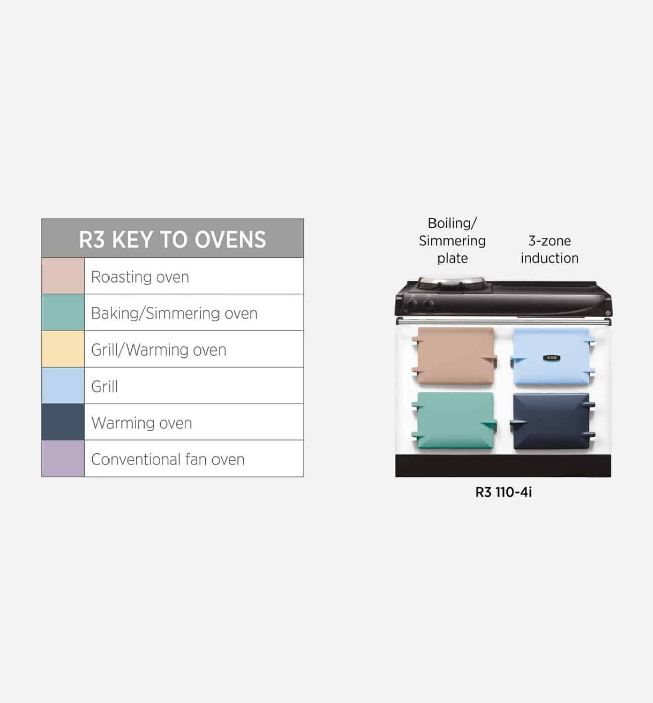 - The AGA R3 Series 110 features a cast-iron heat storage roasting oven, an enamelled baking/simmering oven as well as a warming oven and an integrated, infrared grill.
