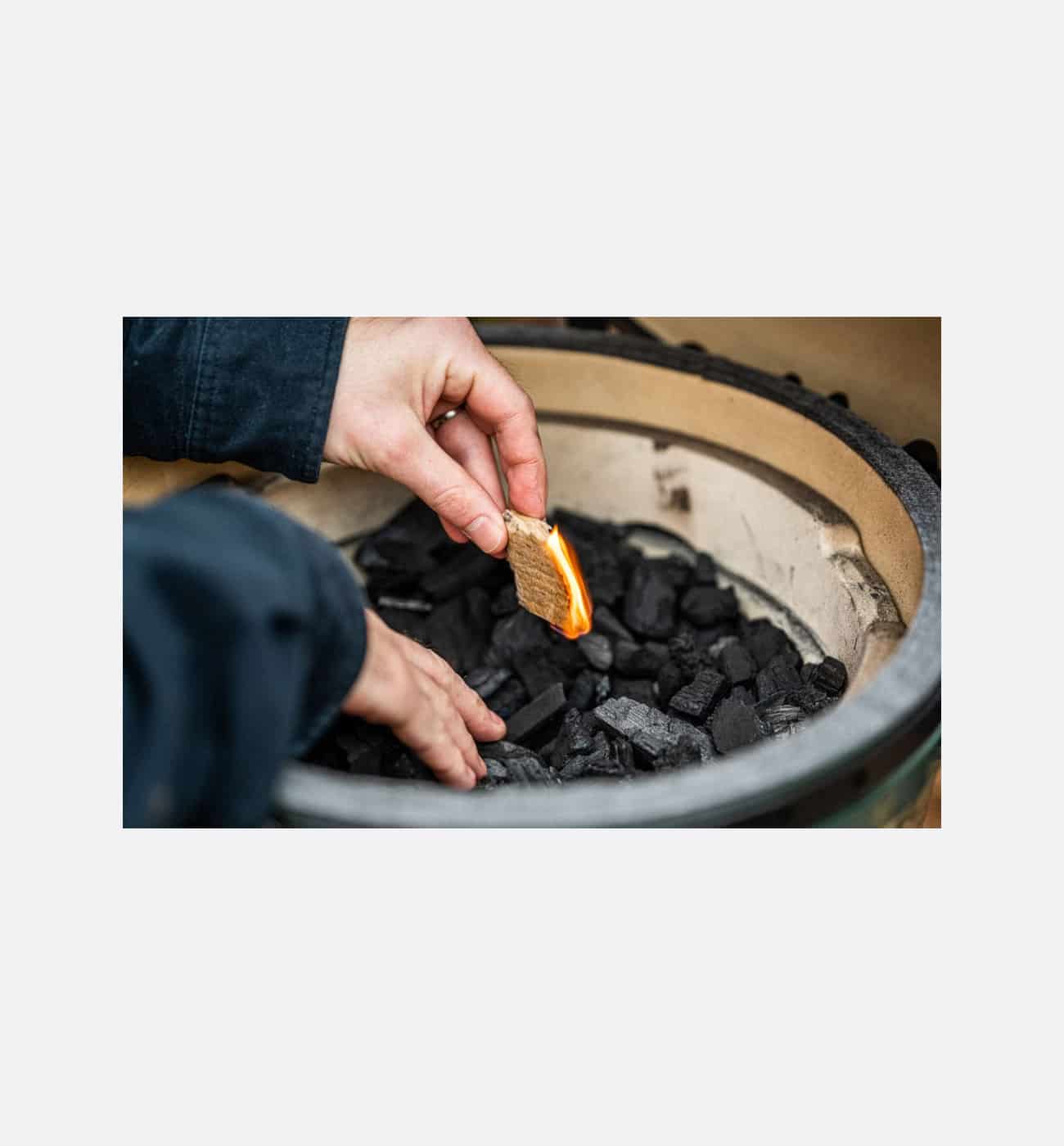Simply light the corner of one firestarter, and place it in the centre of your charcoal. Leave the lid open and come back in 10 minutes for smouldering embers. Close the lid, and you’ll be ready to cook in another 10.