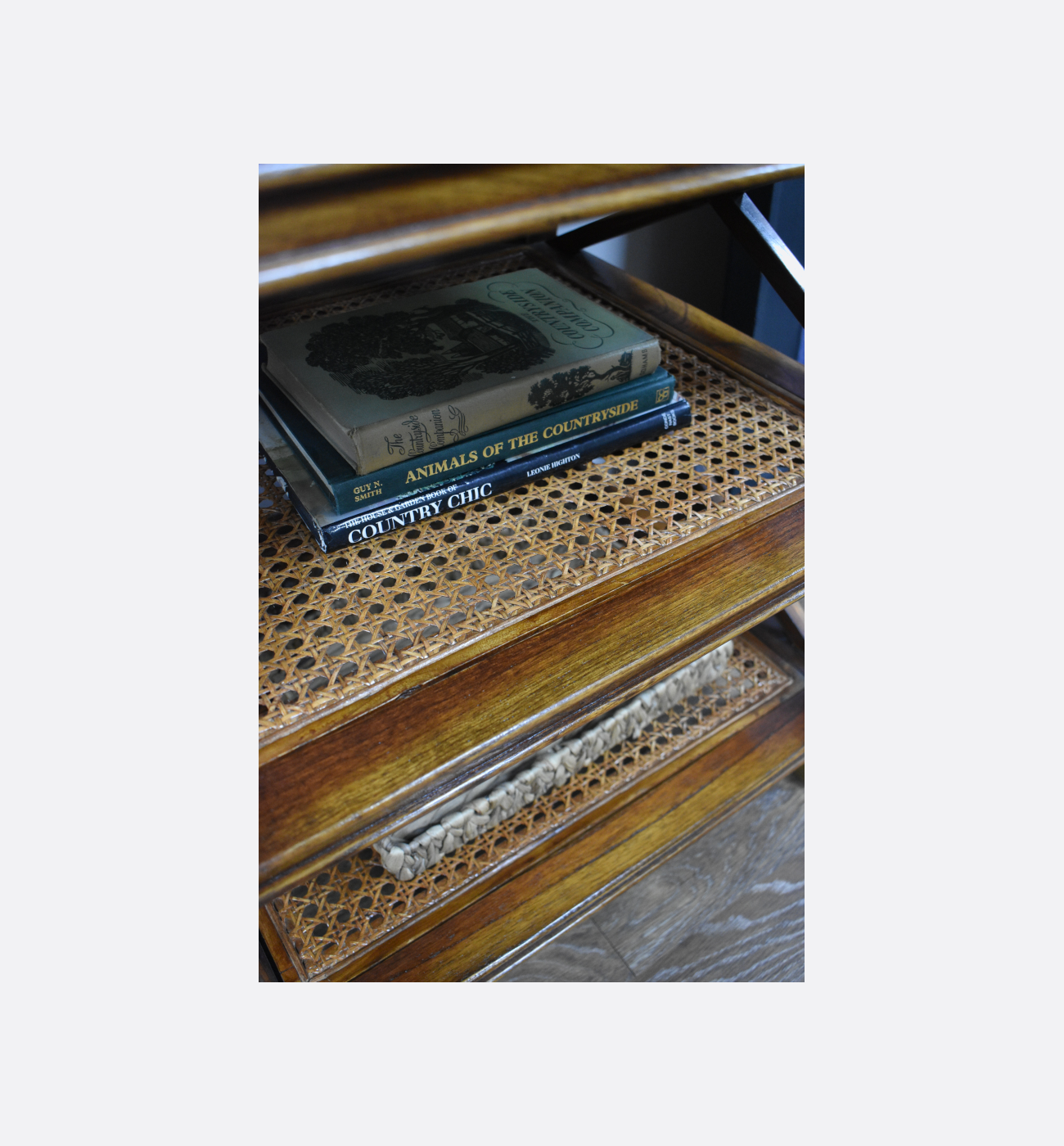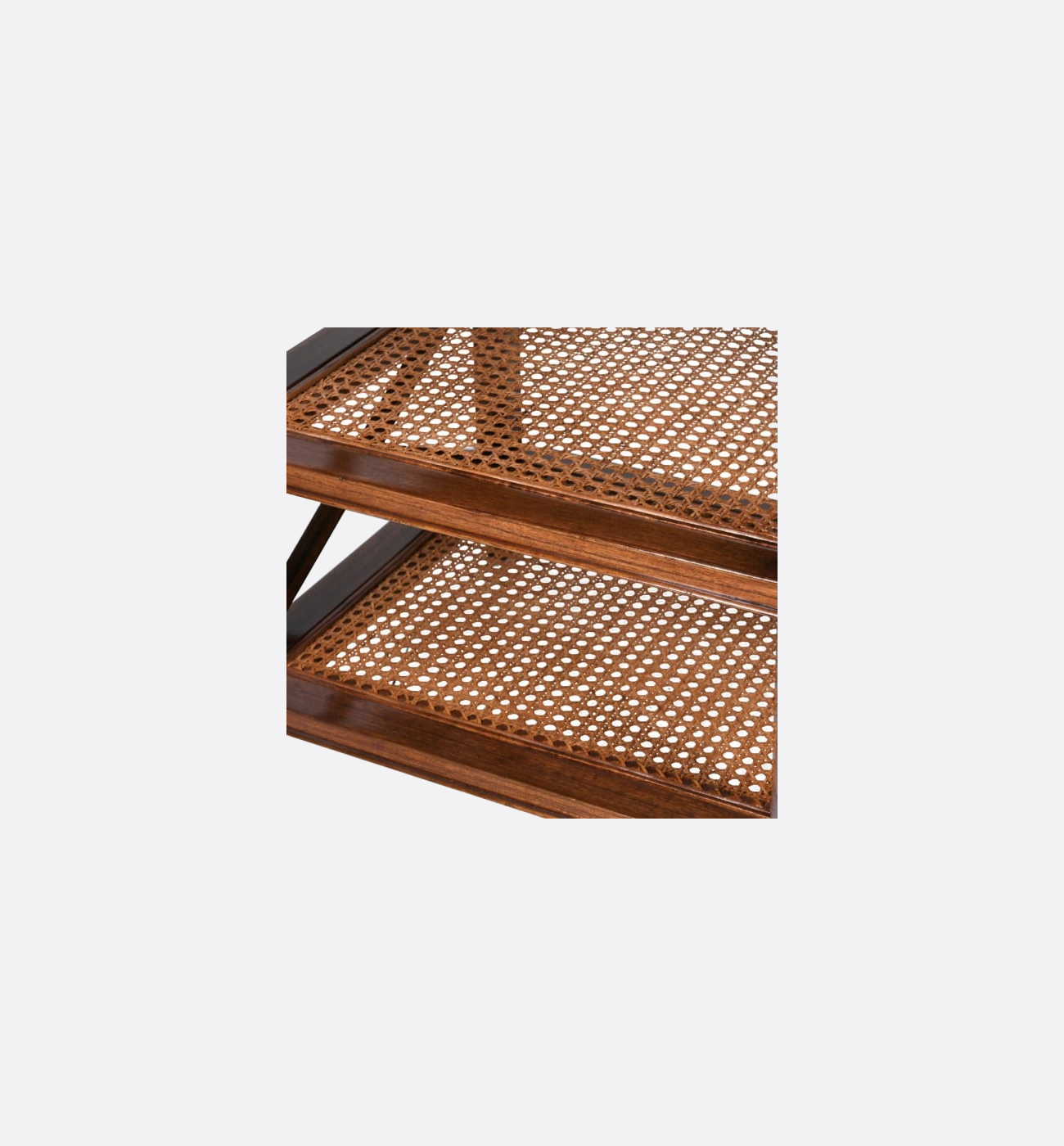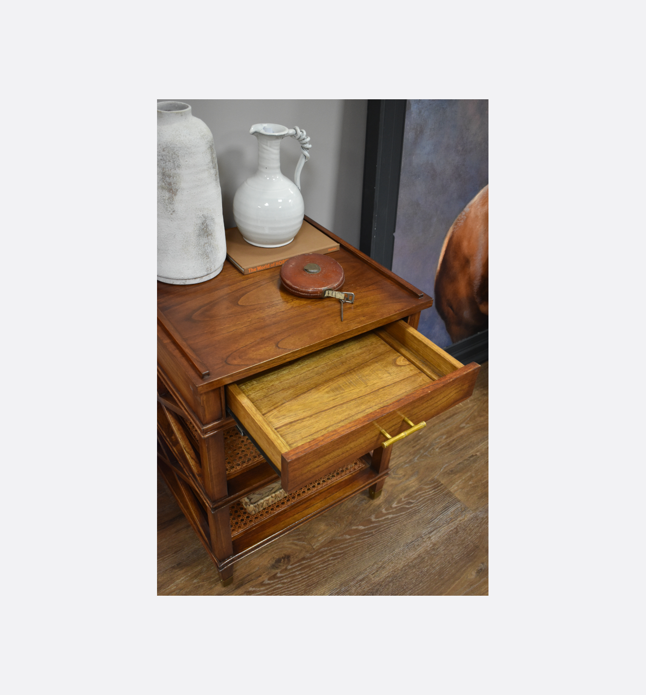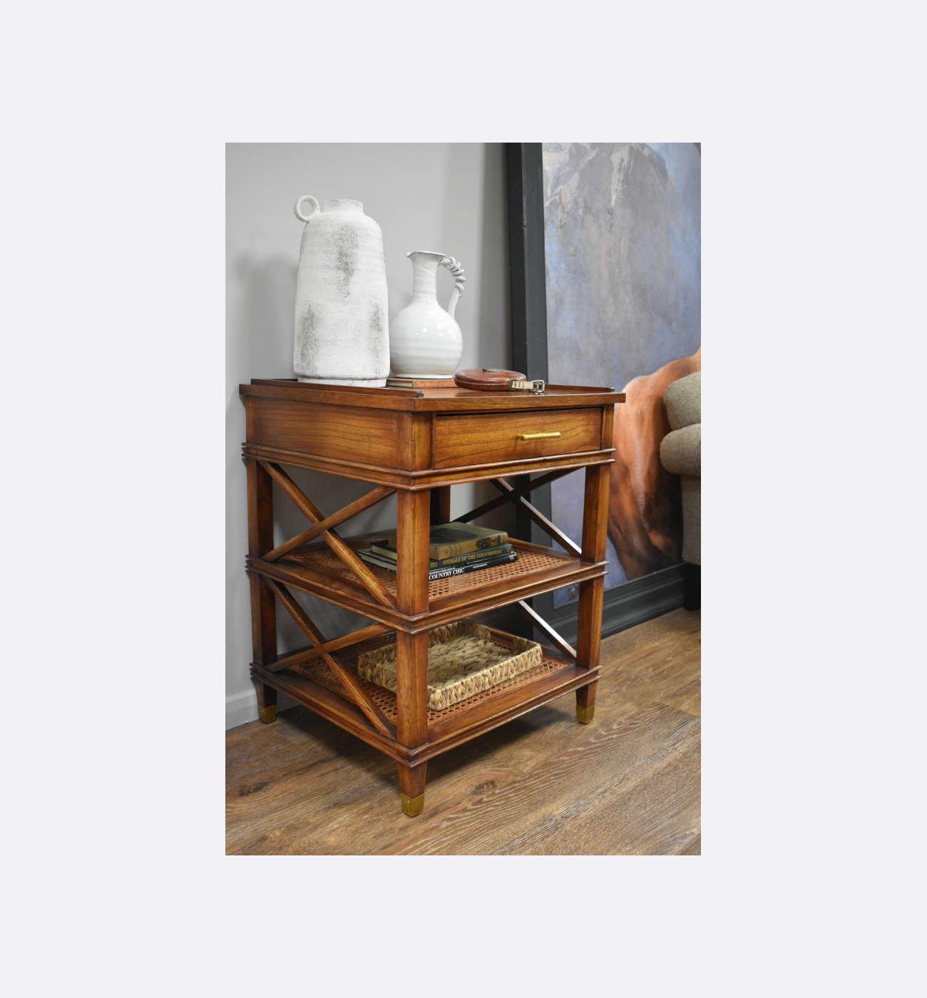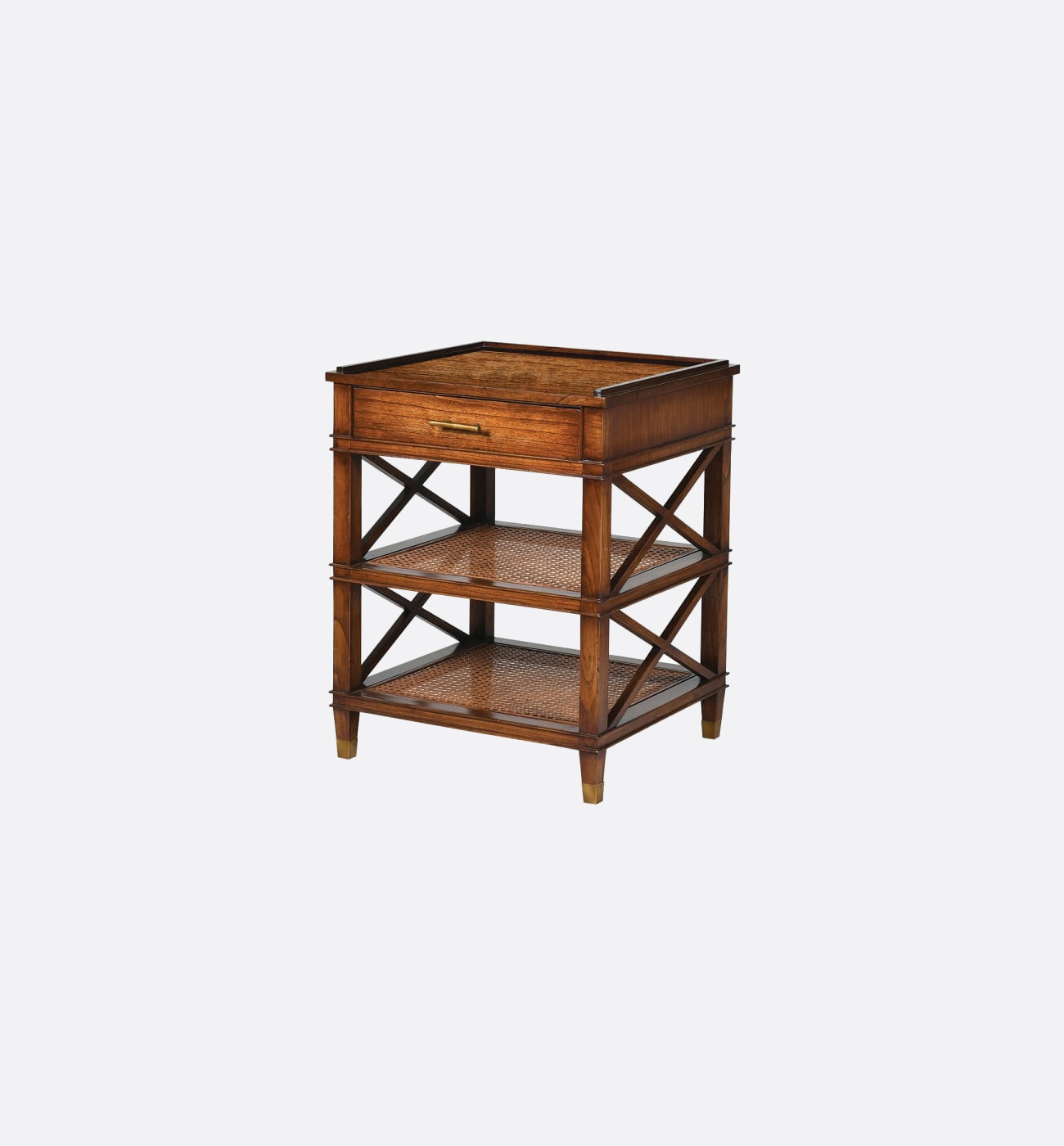 This elegant side table combines warm wood tones with refined craftsmanship, offering both style and practicality. It features a single drawer with a sleek brass handle, ideal for keeping essentials close to hand, along with two woven rattan shelves that add texture and provide useful display or storage space. Crossed side supports and brass-capped feet complete the design, creating a piece that feels timeless, sophisticated, and perfect for elevating any living area or bedside setting.