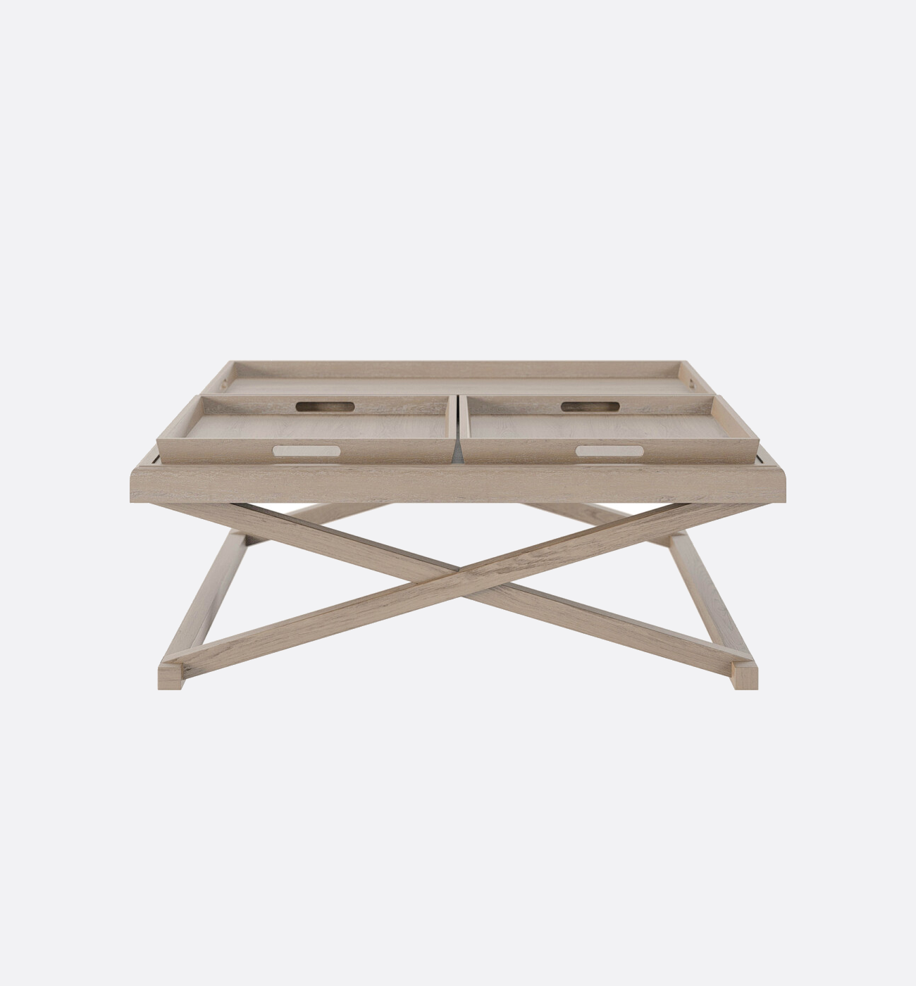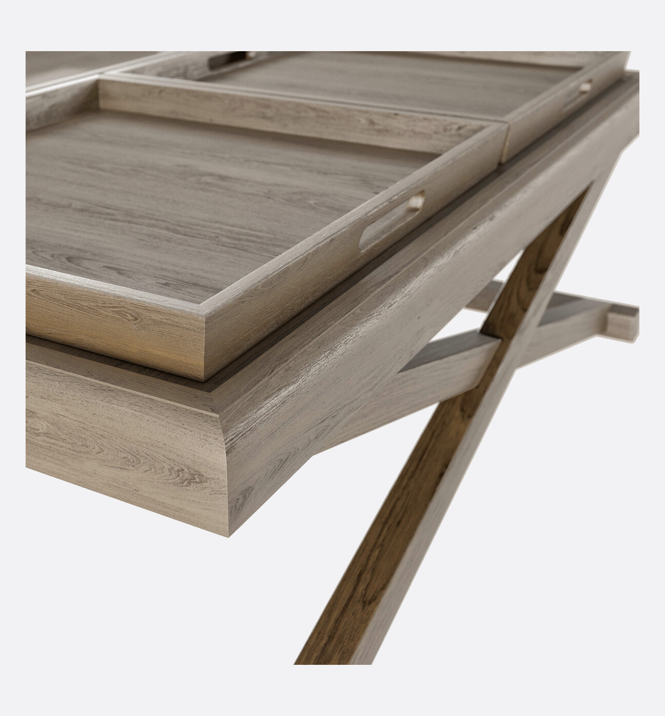 Coffee table in grey aged oak and oak veneer, 3 removable trays, crossed legs, visible grain. MATCHING CONSOLE TABLE – See Bentley console table listing.