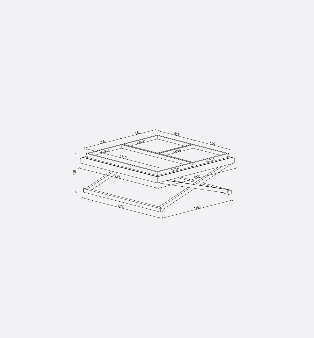 Coffee table in grey aged oak and oak veneer, 3 removable trays, crossed legs, visible grain.