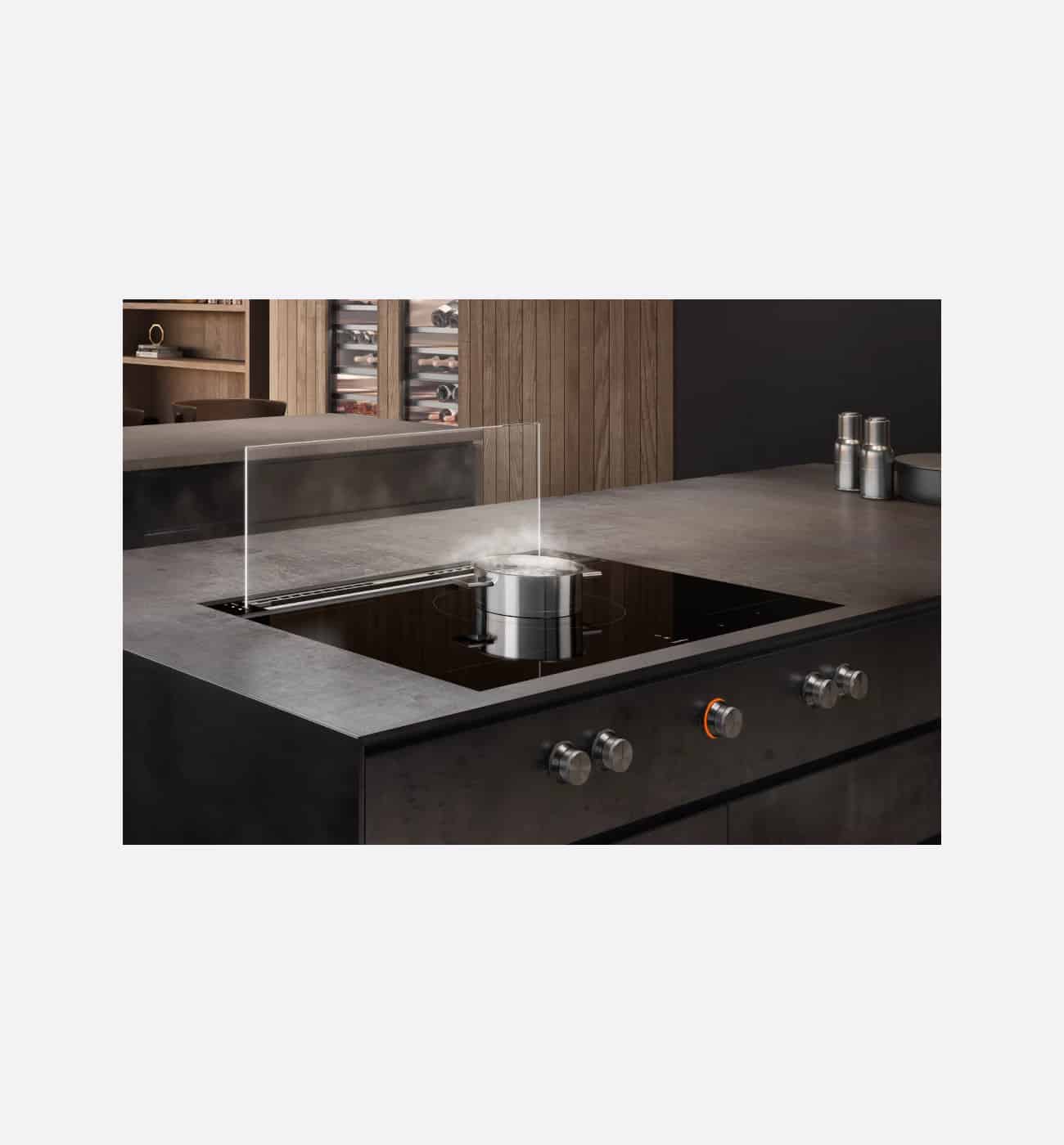 - Extendable table ventilation, when not in use can be completely lowered into the worktop. Perfect cooking and ventilation combination with frameless induction cooktops 80 cm wide for flush mounting in a single worktop cut-out.