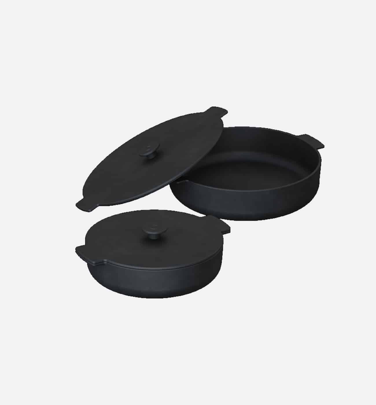 This set consists of two sleek cast iron pans with diameters of 21cm and 26cm. The pans are perfectly suited to be used on the OFYR cooking plate to prepare all kinds of dishes. The pans are characterised by perfect heat distribution. The knob on the lid of the pan can become very hot. Therefore, use heat-resistant gloves such as the OFYR gloves to remove the hot lid.