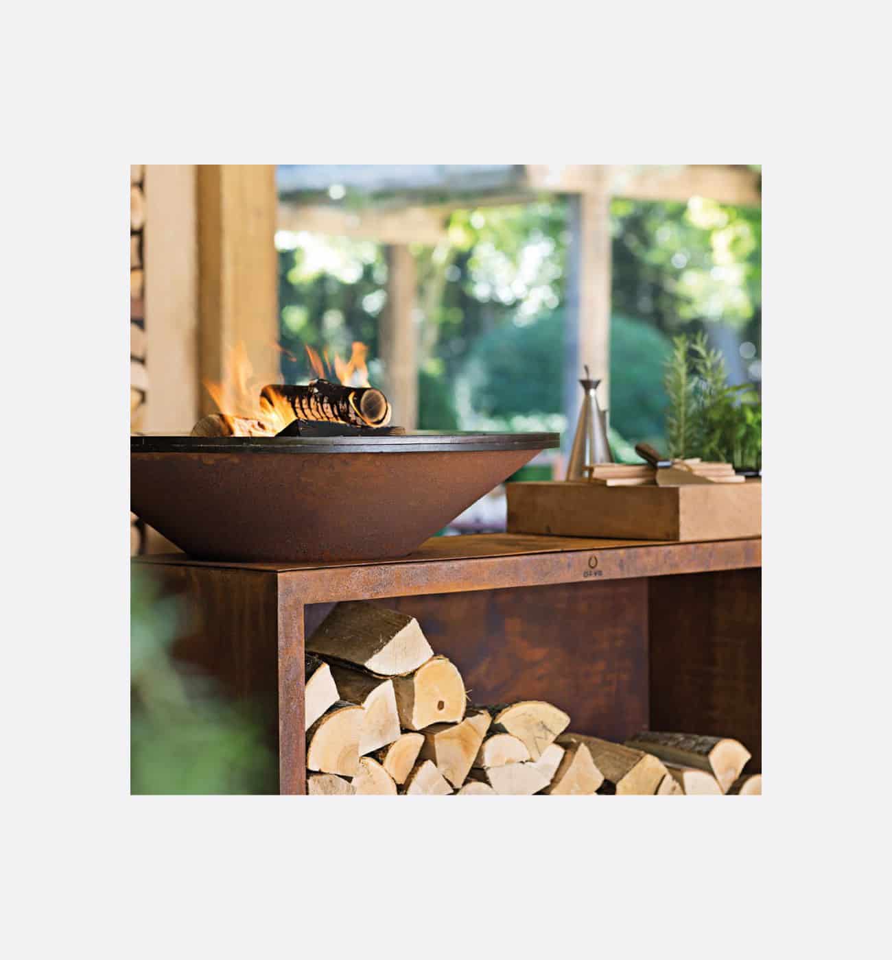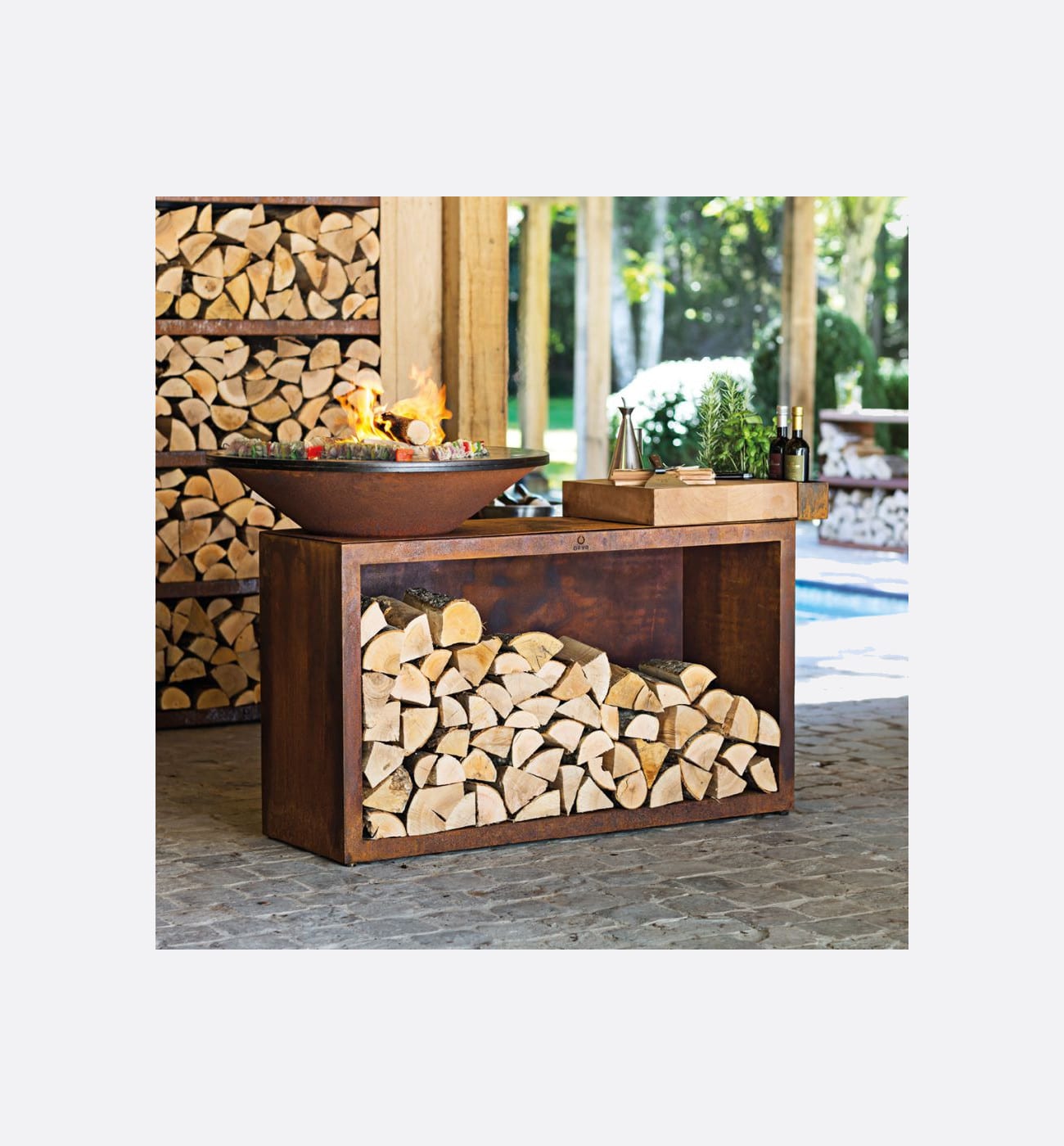 This all-in-one unit combines unbeatable style and functionality in a compact design. The OFYR Island provides everything you need for an ultimate outdoor cooking experience with friends or family. It includes an 85 cm or 100 cm OFYR cooking unit with wood storage, a chopping board and a handy accessories tray for utensils and condiments. The chopping board is available in teak wood or dark grey ceramic.