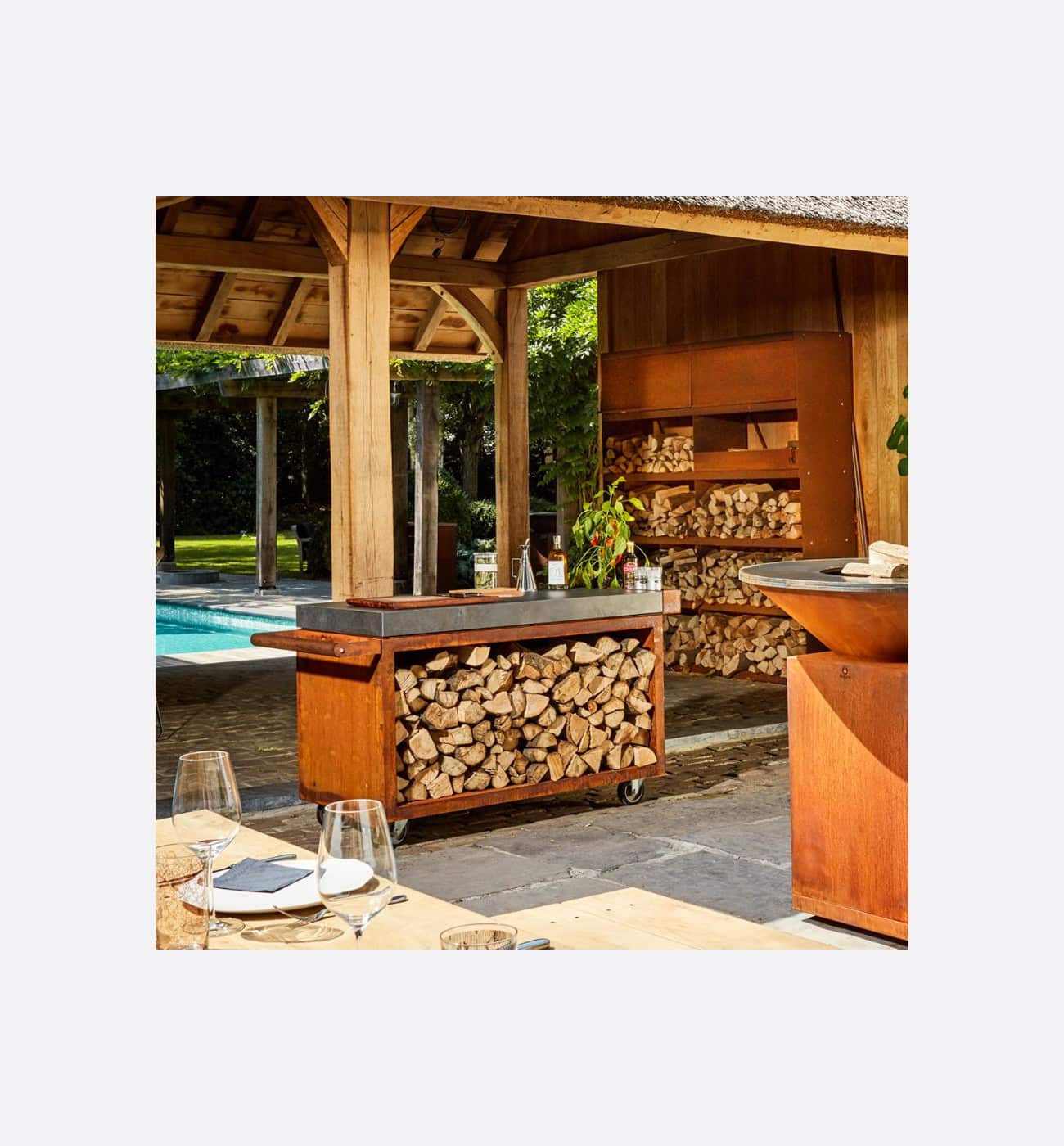 A ceramic worktop can be left outside permanently, a teak wood worktop is best placed indoors in a dry area and should be treated regularly with an oil suitable for food.