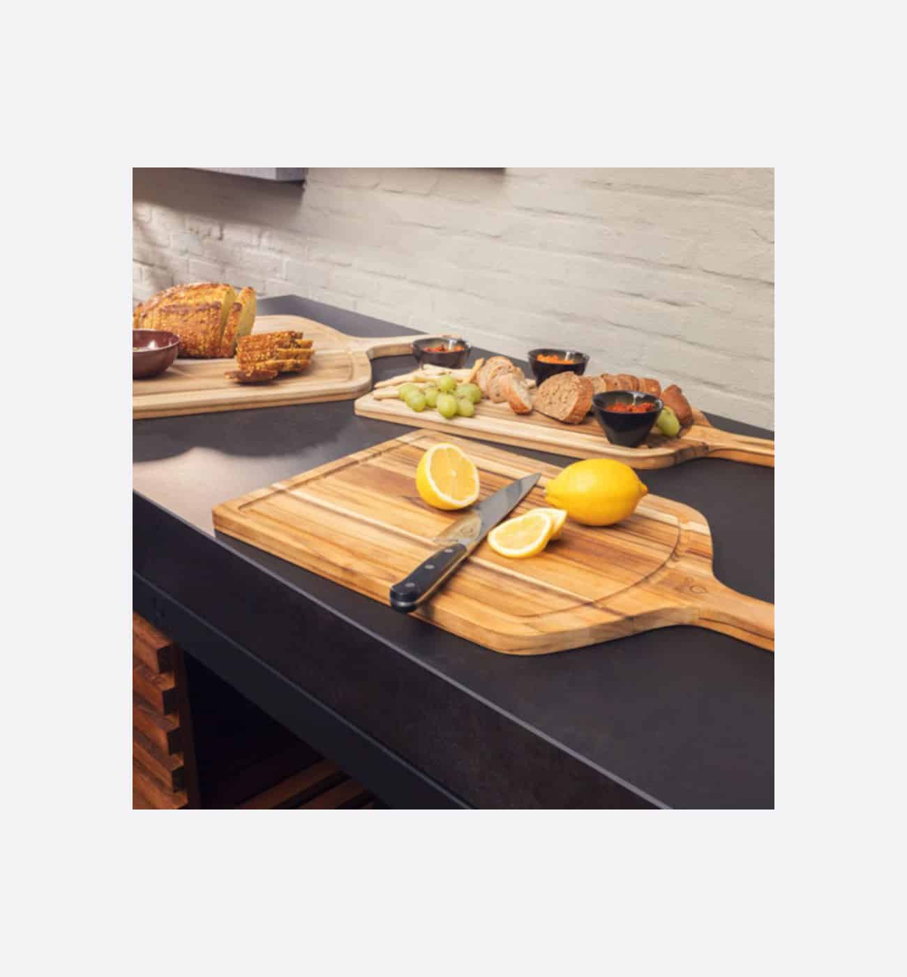 Serve your food in style on the OFYR Serving Boards. This set includes 3 high-quality boards made of teak. The boards have a long handle that is comfortable to hold. The hole at the top of the handle makes it easier to store the boards, by hanging them from a hook in the kitchen. The 3 boards have the same height but differ in the width, making them perfect for serving various types of dishes.