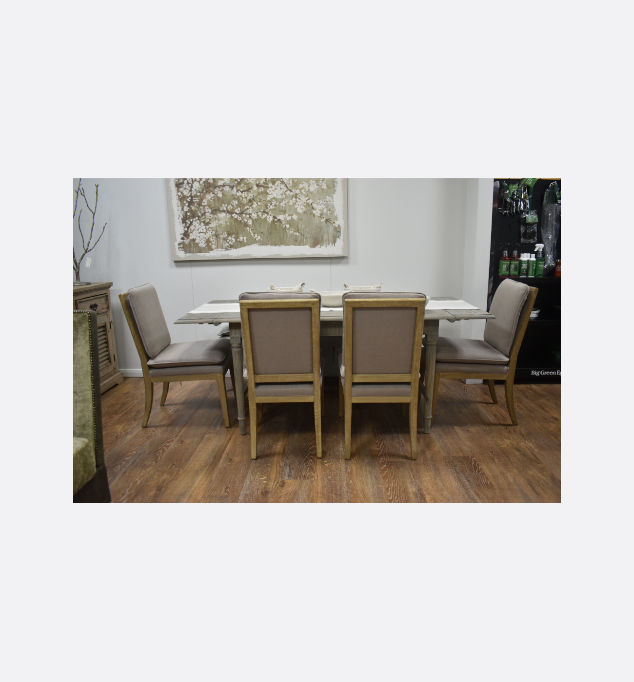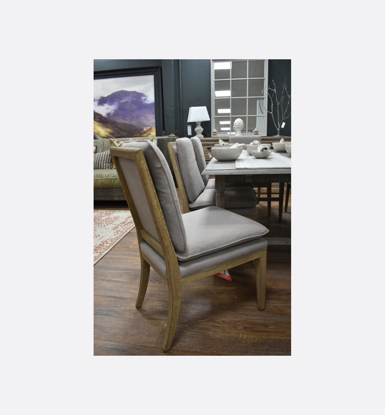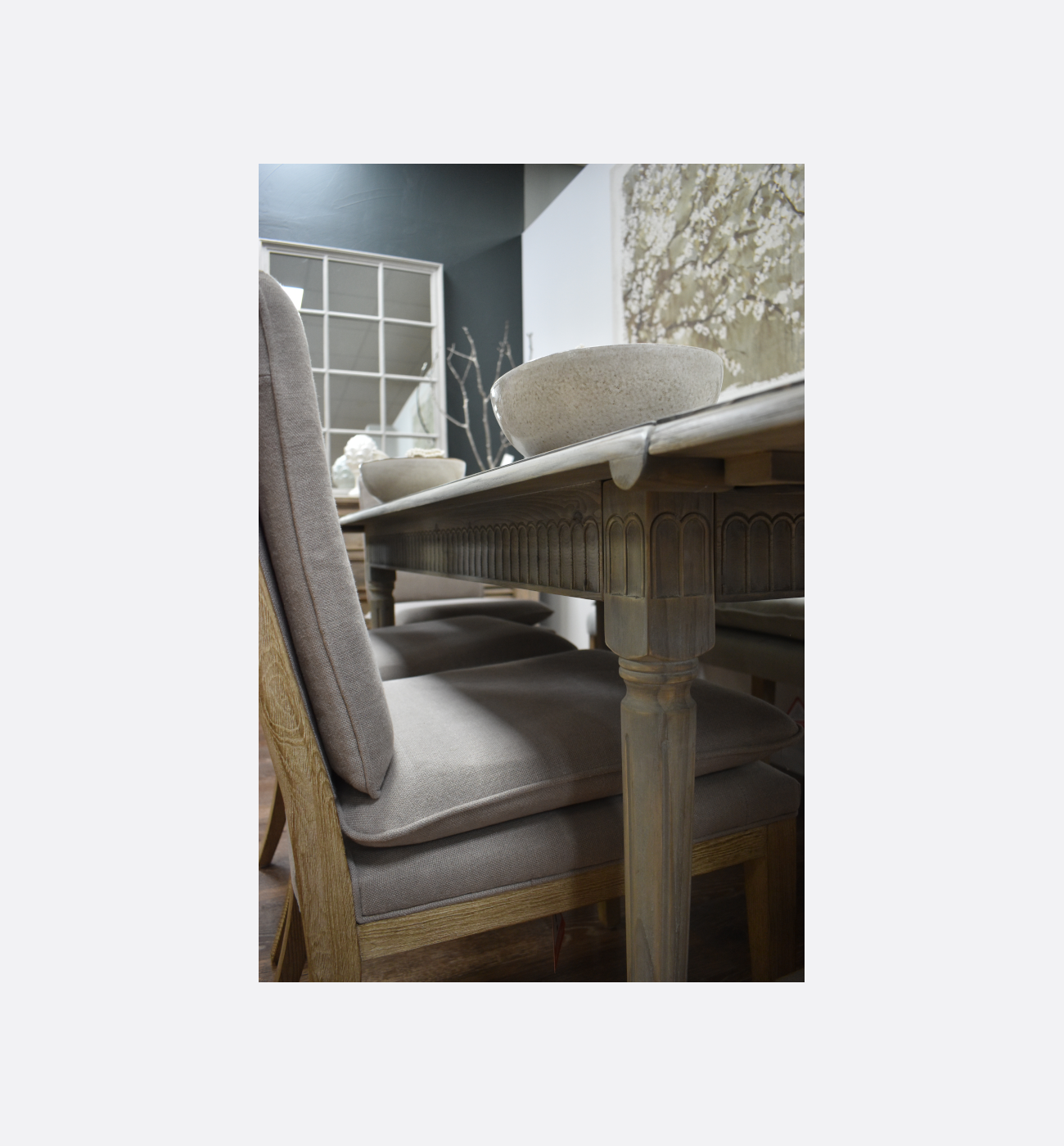 The set includes four dining chairs upholstered in warm grey linen and a complimenting bench in Eau de Nil fabric. Although the fabrics differ, the tones beautifully complement each other, creating a cohesive and inviting look. Ideal for both daily dining and relaxed entertaining.