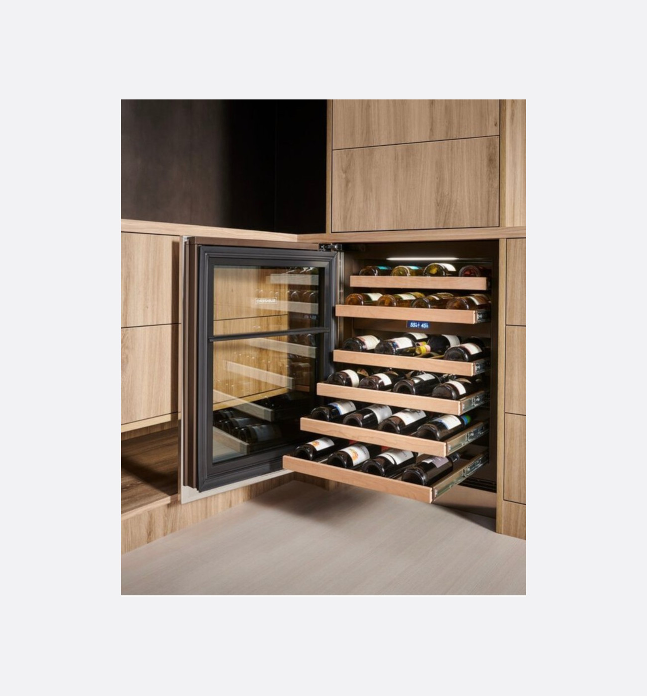 The UV-resistant glass door prevents light exposure and dual evaporators maintain constant, moderate humidity so corks and labels stay intact.