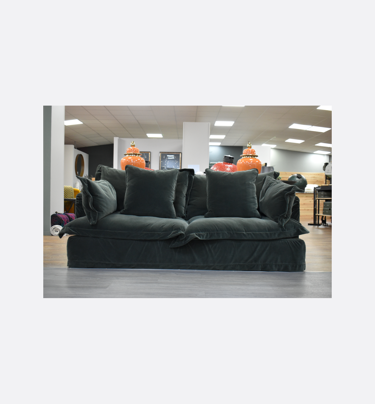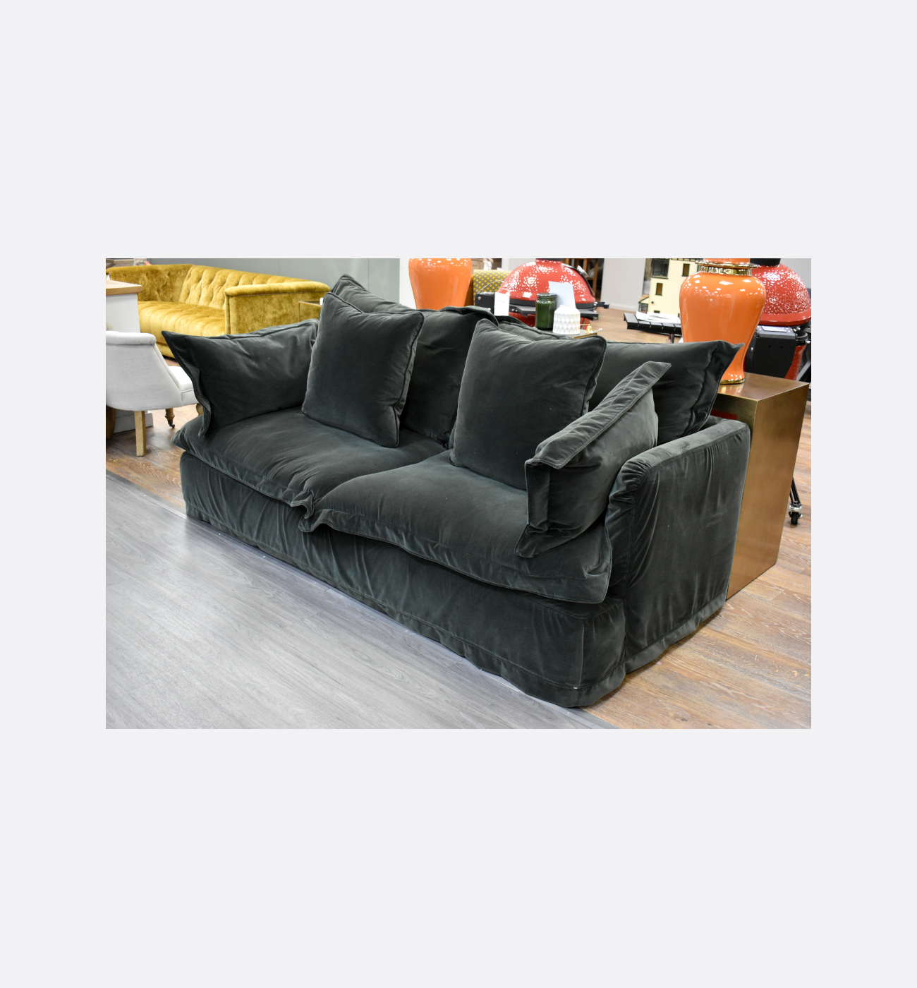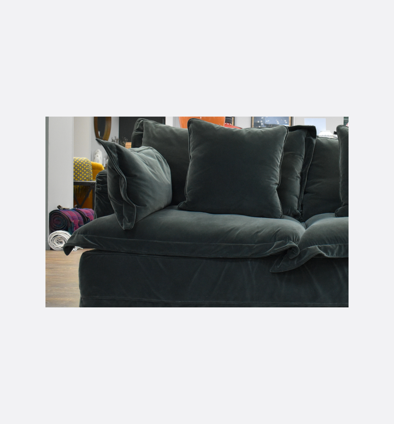 Elevate your living room with this beautiful ex-display Ava Midi Sofa in sumptuous emerald green velvet. Featuring Tetrad’s signature loose‐cover design, the slipcovers are removable and washable – perfect for maintaining freshness and style, especially in a busy home. Complete with x2 extra cushions in matching fabric.