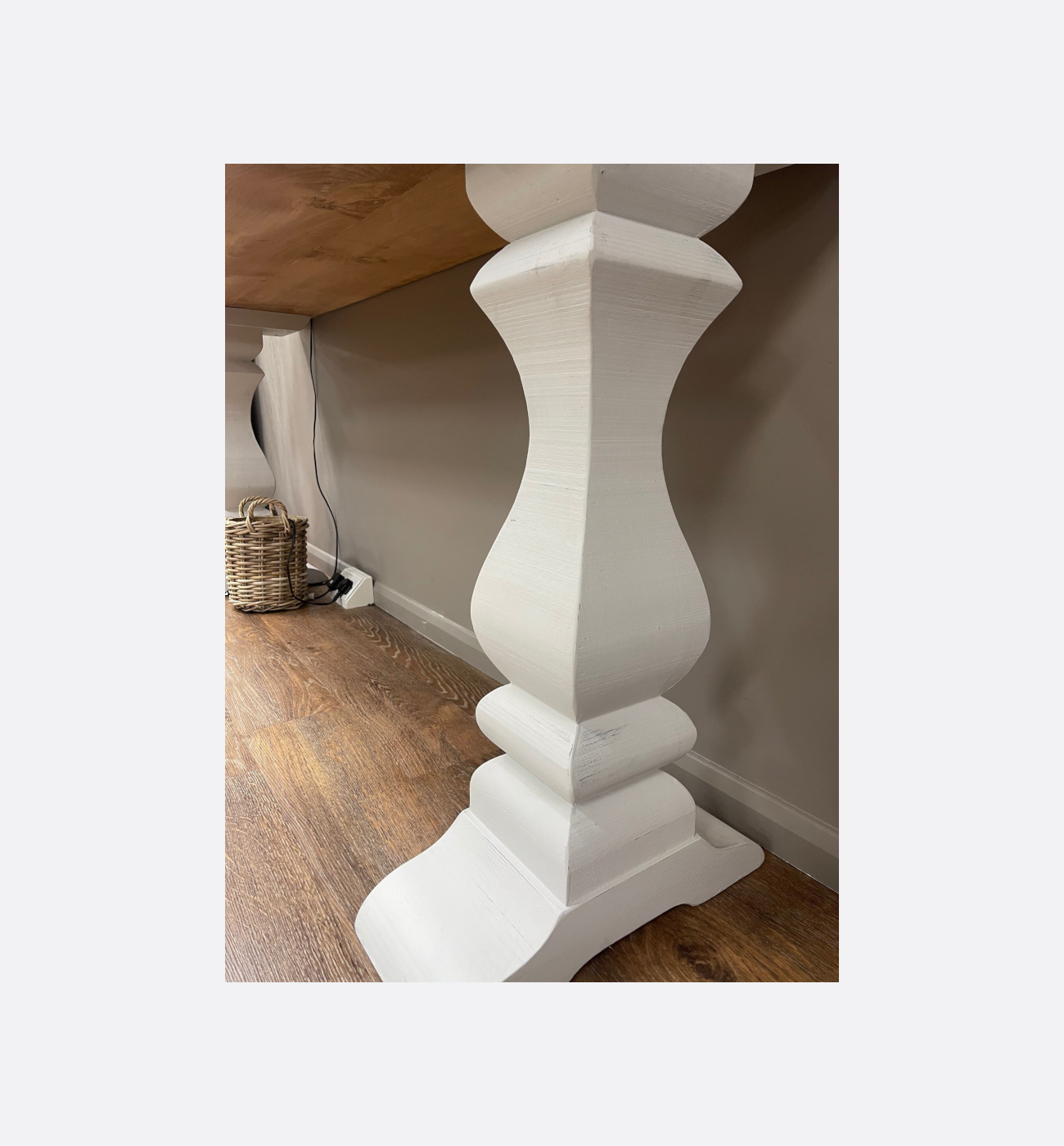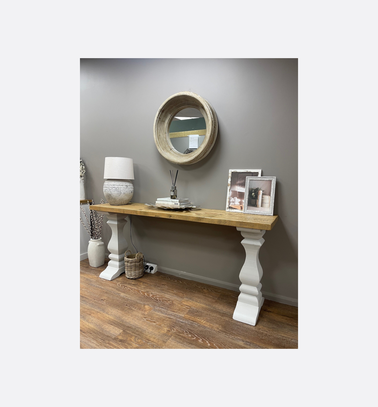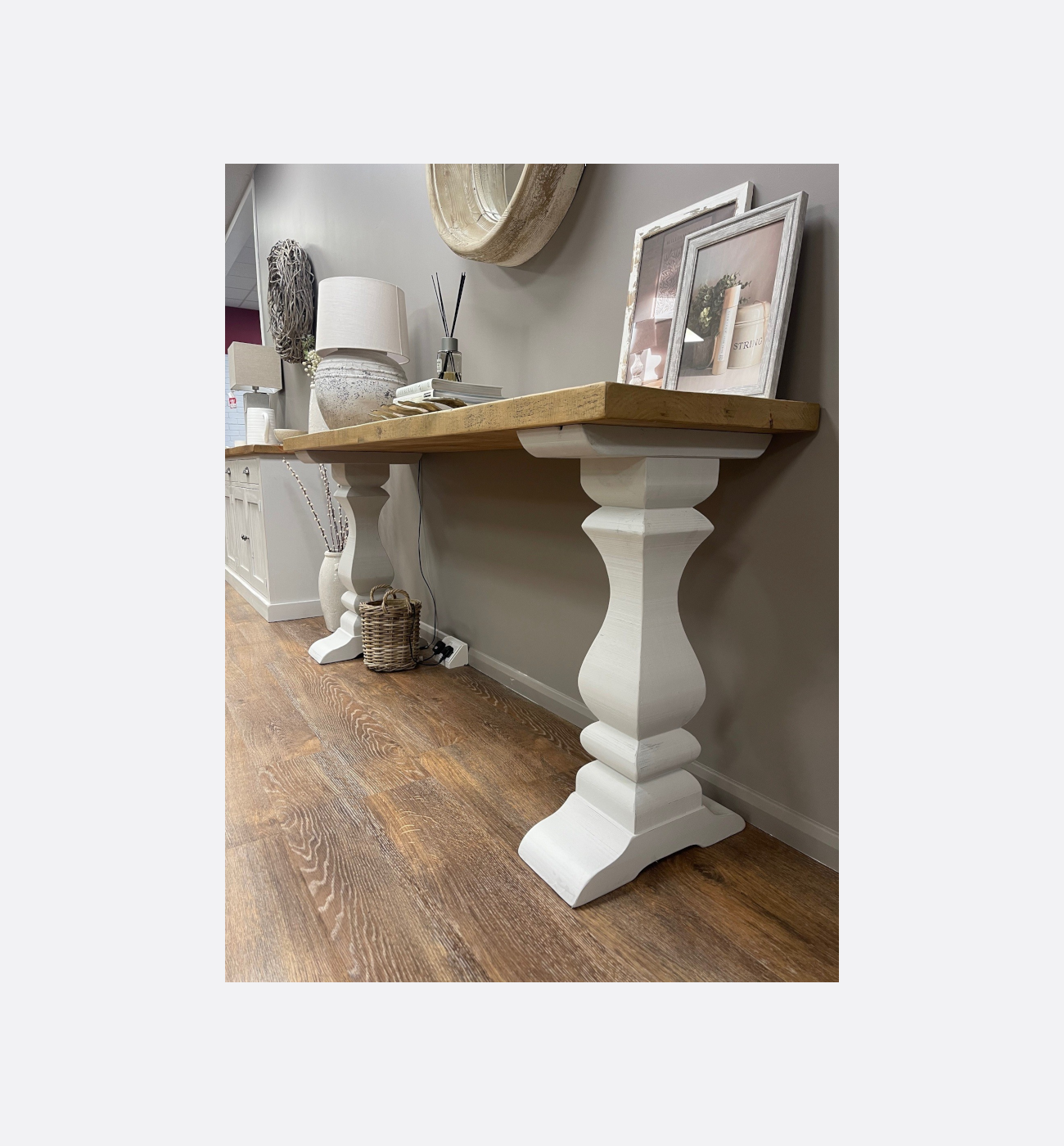 This elegant console table perfectly complements the matching sideboard, offering the same blend of rustic charm and refined styling. Featuring a solid wood top with a warm, characterful grain, it sits on beautifully sculpted pedestal legs painted in a soft, distressed white finish for a timeless look.