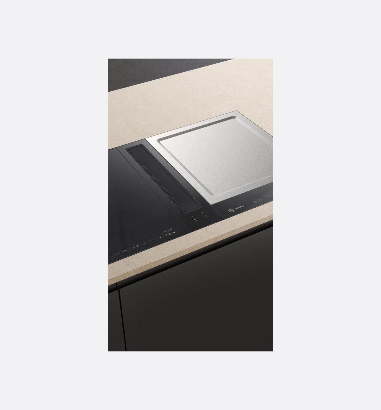 The downdraft extractor rises from the cooking surface, perfectly matching the panorama induction hob. An elegant addition to the kitchen, creating a cohesive and elevated look.