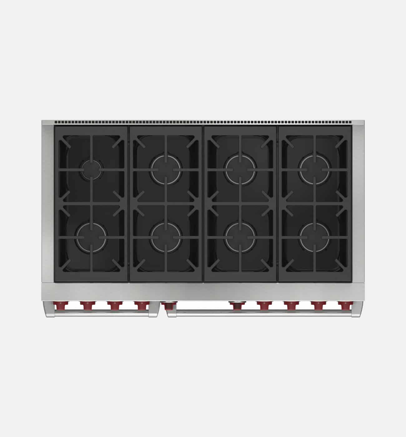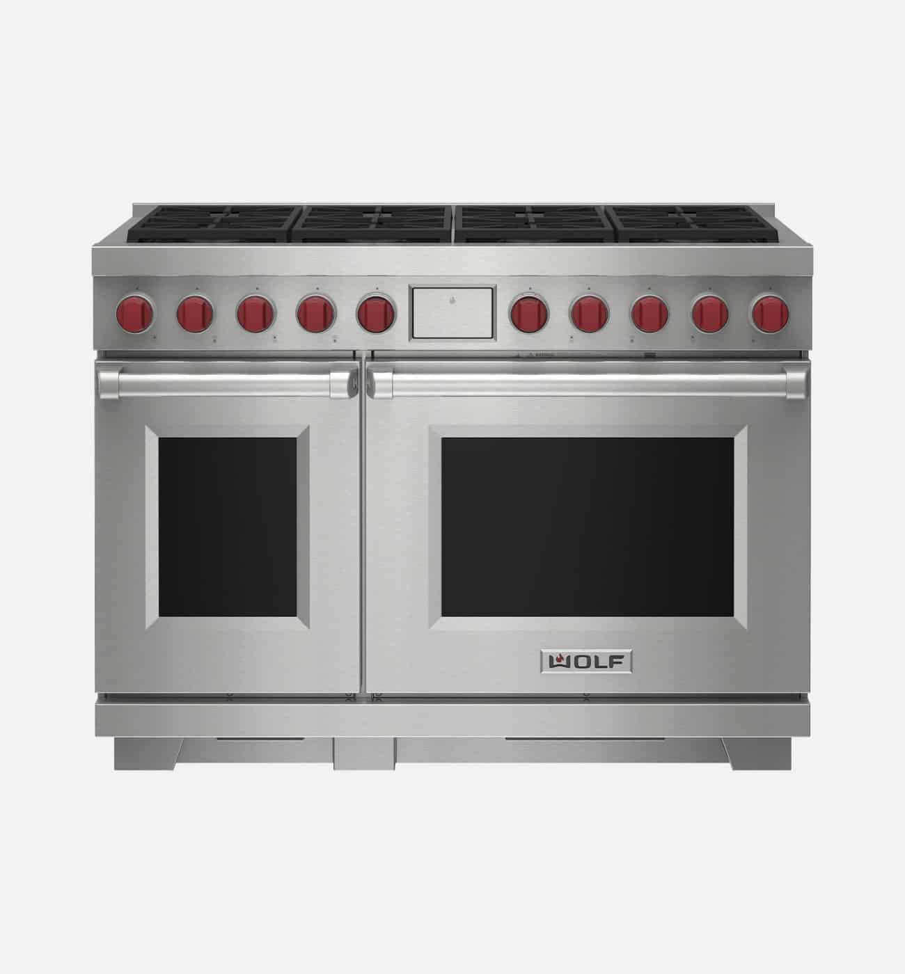 - Wolf’s patented gas dual-stacked ranger cooker with 8 burners features a sealed burner design and provides precise high-to-low temperature control and a spark ignition system that reignites the burner automatically.