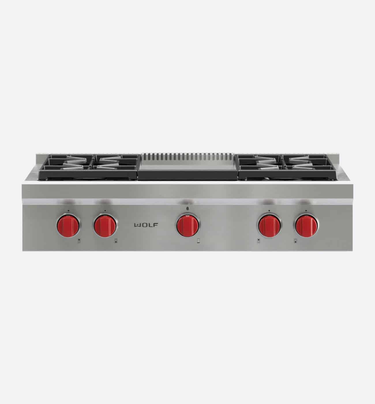 - There is a reason why so many professional chefs choose gas cooking: control. Wolf takes that control up a notch with the four innovative burners on its 91cm sealed burner range top with 4 burners and griddle.