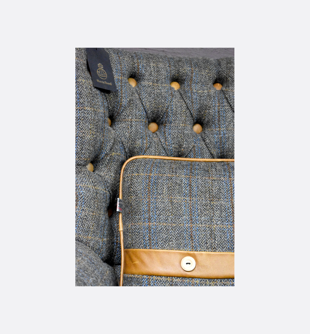 This premium armchair brings a timeless silhouette with gently curved arms and crisp, elegant lines that suit both classic and contemporary interiors. Upholstered in Usit Night Harris Tweed with Cerato Brown leather piping and buttons, it’s handcrafted using traditional techniques and finished with subtle stud detailing.