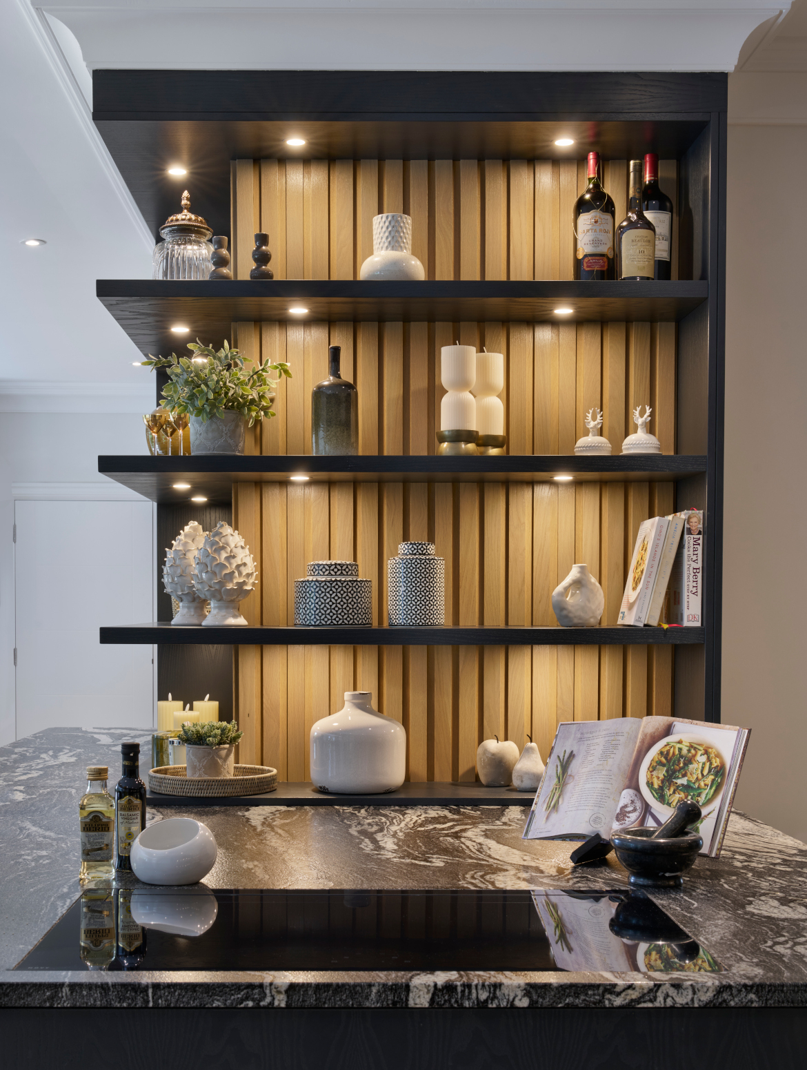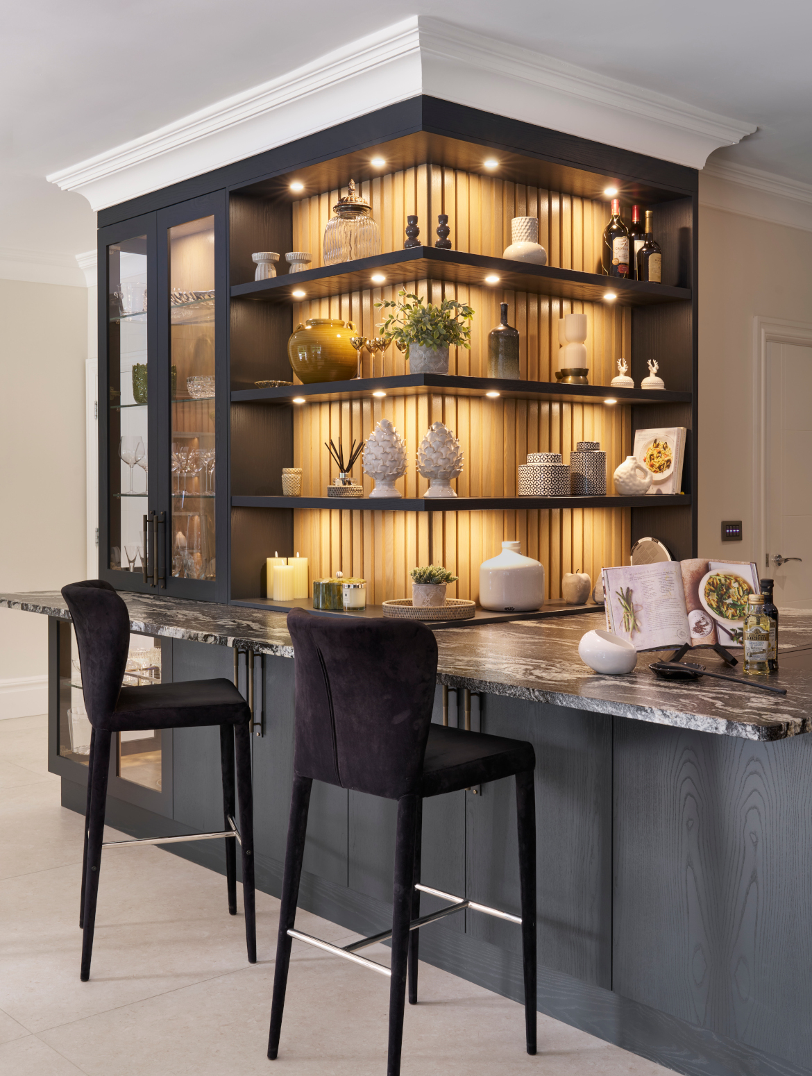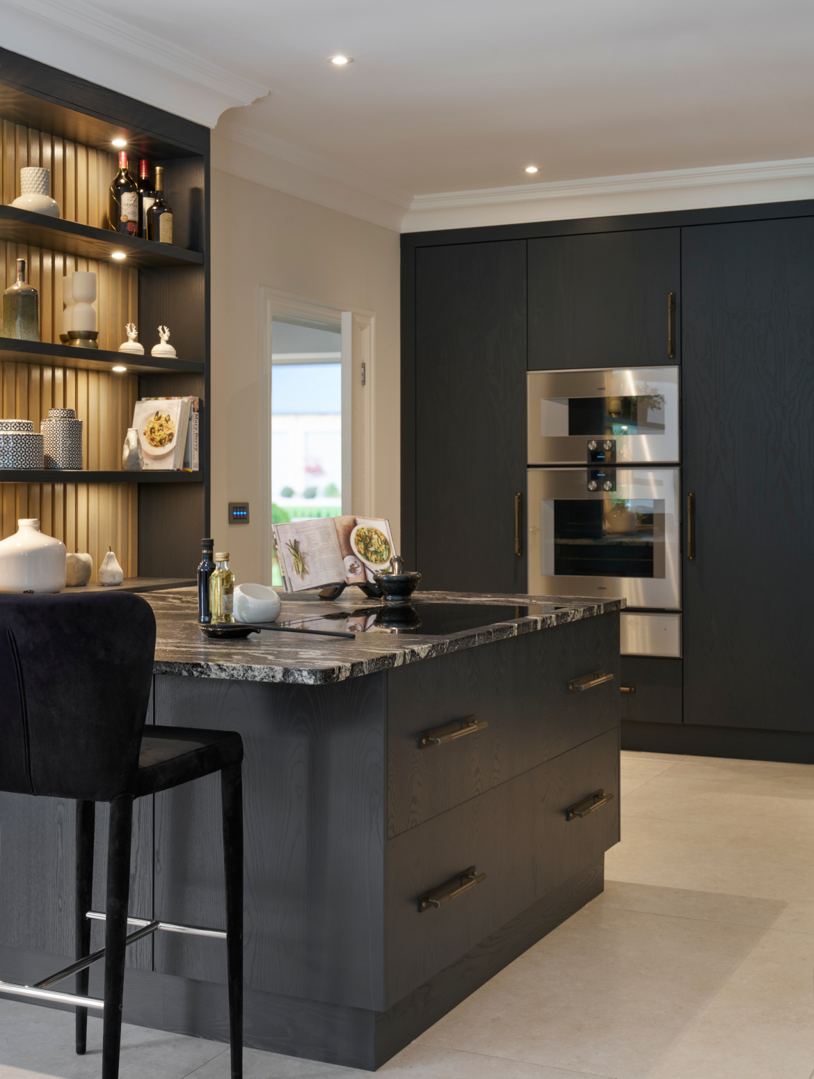 Smooth simplistic slab doors form a clean architectural backdrop, beautifully elevated by the striking Black Beauty worktop, its mesmerising veining adding depth and drama to the design. Functionality was central to the brief, from the professional-grade Gaggenau and Sub-Zero appliances to the bespoke breakfast pantry and feature peninsula that combines open shelving, ambient lighting, and integrated seating, creating a social focal point that’s as practical as it is beautiful.