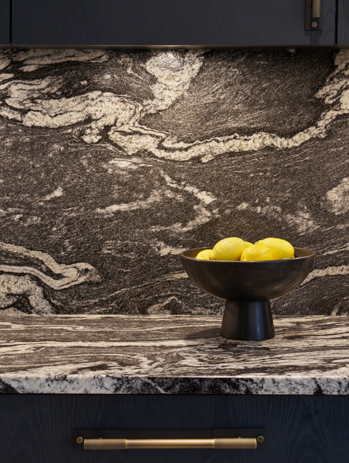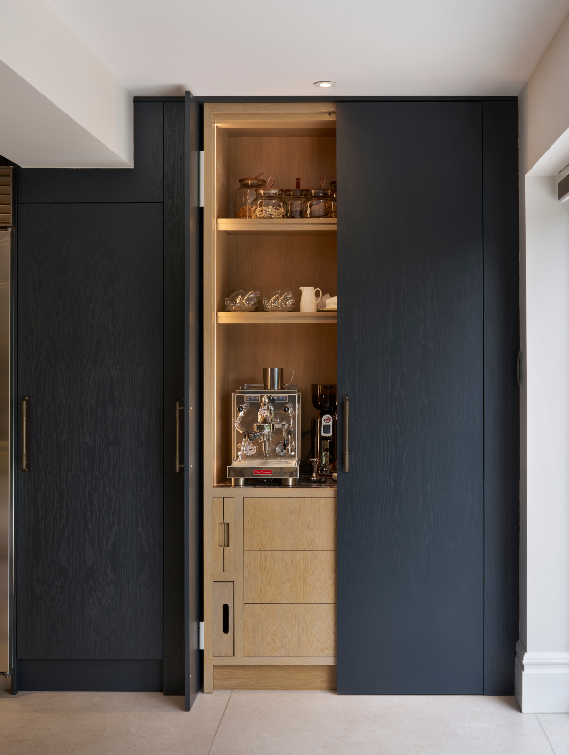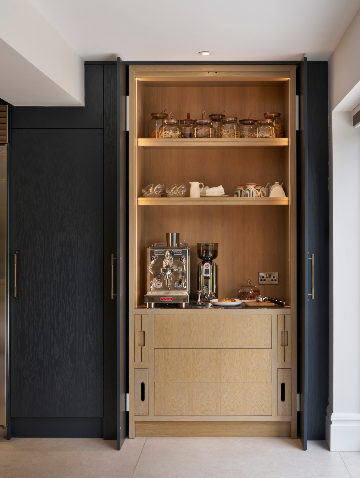 Smooth simplistic slab doors form a clean architectural backdrop, beautifully elevated by the striking Black Beauty worktop, its mesmerising veining adding depth and drama to the design. Functionality was central to the brief, from the professional-grade Gaggenau and Sub-Zero appliances to the bespoke breakfast pantry and feature peninsula that combines open shelving, ambient lighting, and integrated seating, creating a social focal point that’s as practical as it is beautiful.